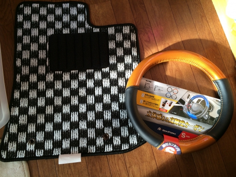 写真は待ってる間に購入したフロアマットとハンドルカバーです。ハンドルカバーは意外に少ないオレンジので気に入りましたが、フロアマットがあまりに安っぽい。アマゾンで実物見ずに買っちゃって少し後悔してます。せめてテイクオフのにすれば良かったです。あとはシートカバーをユアブランドにするかDottyにするか悩み中です。